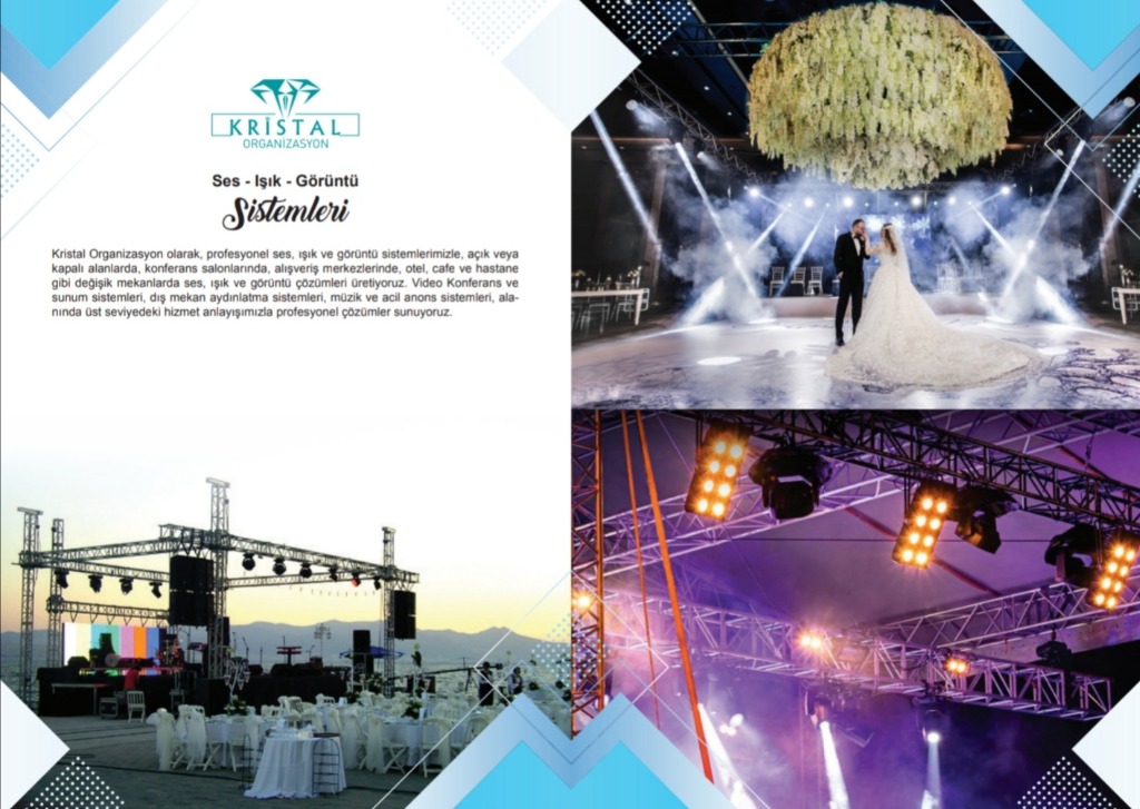 Kristal organizasyon olarak profesyonel ses, ışık ve görüntü sistemlerimizle, açık veya kapalı alanlarda, konferans salonlarında, alışveriş merkezlerinde, otel, cafe ve hastane gibi değişik mekanlarda ses, ışık ve görüntü çözümleri üretiyoruz. Video Konferans ve sunum sistemleri, dış mekan aydınlatma sistemleri, müzik ve acil anons sistemleri, alanında üst seviyedeki hizmet anlayışımızla profesyonel çözümler sunuyoruz.